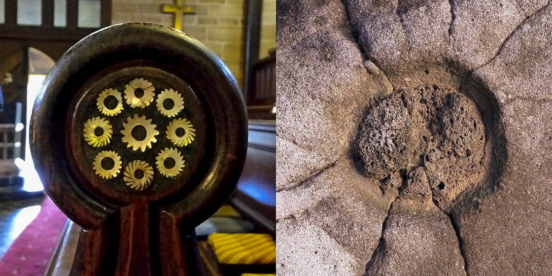 On the left is an image of one of the seat ends of St Barnabas and on the right is a piece of volcanic rock at Crystal Pools on Norfolk Island, that landed in what was then soft sandstone many millenia ago.