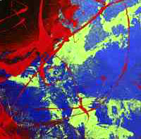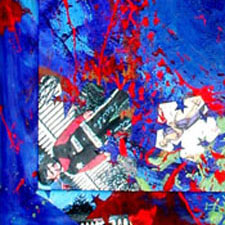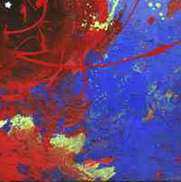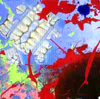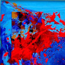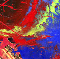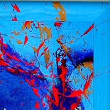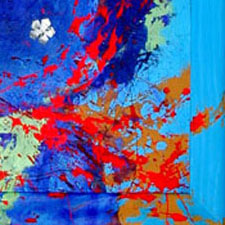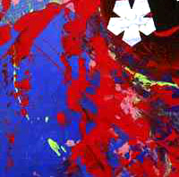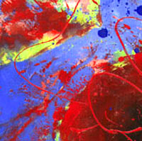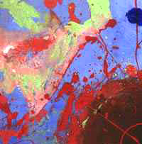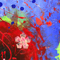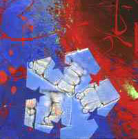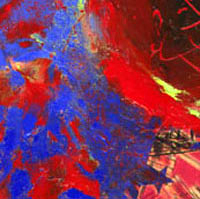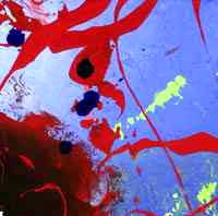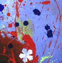 This image is informed by chaos theory - clearly, with painting hurled and flicked from a palette knife. This allows flow to determine the exact placement of the paint. The five sided shapes are Koch snowflakes, which expose how fractal scaling works.