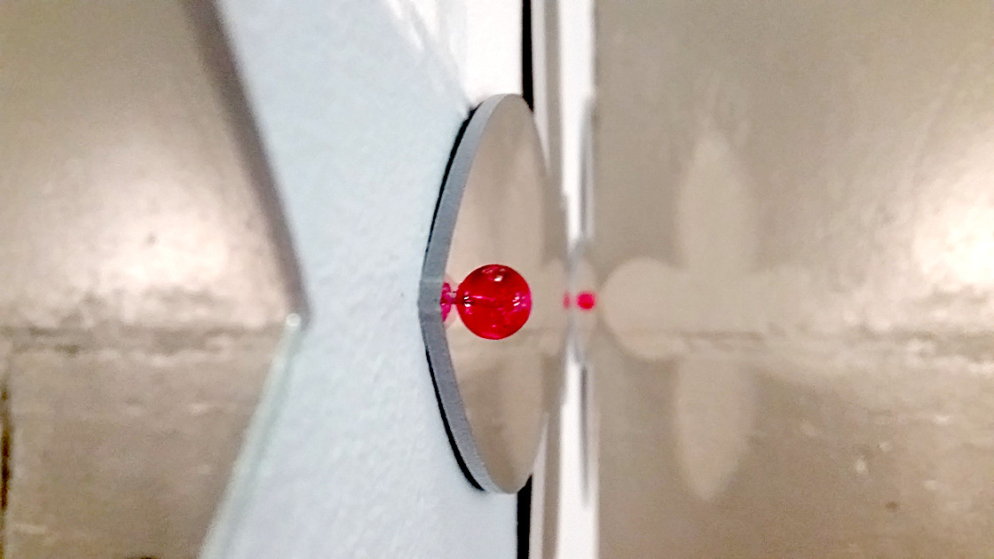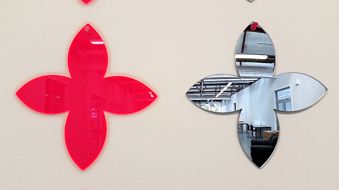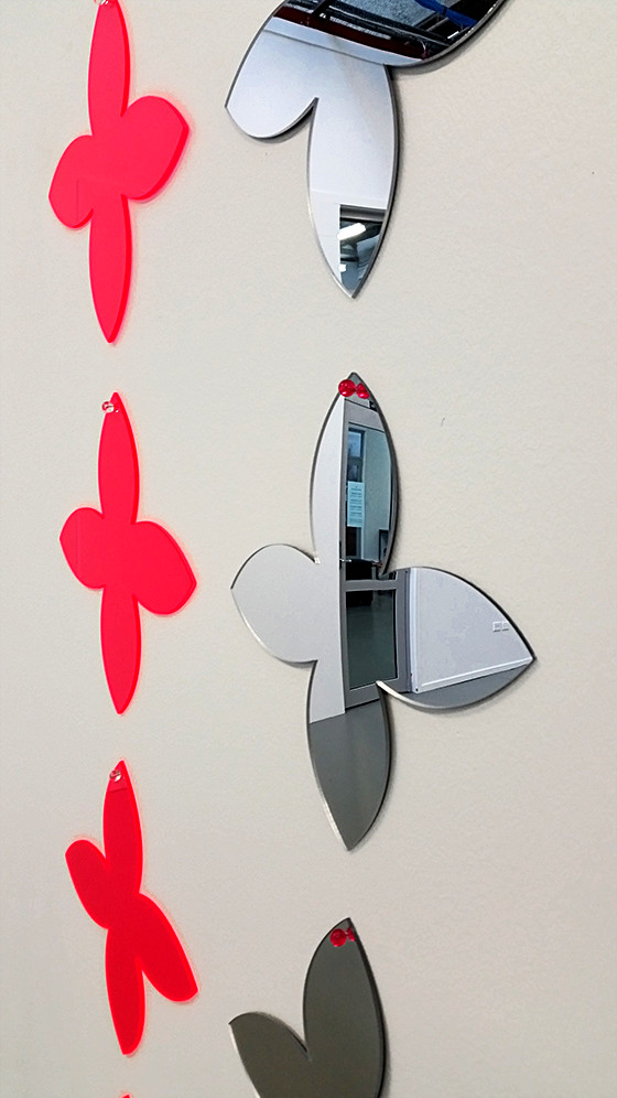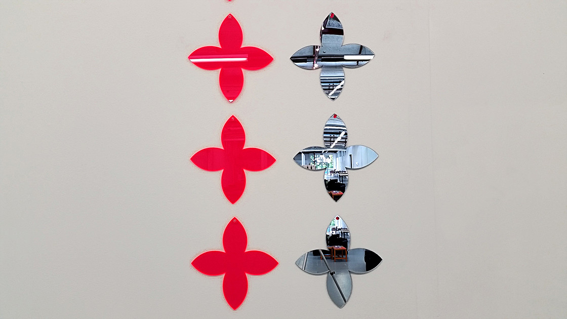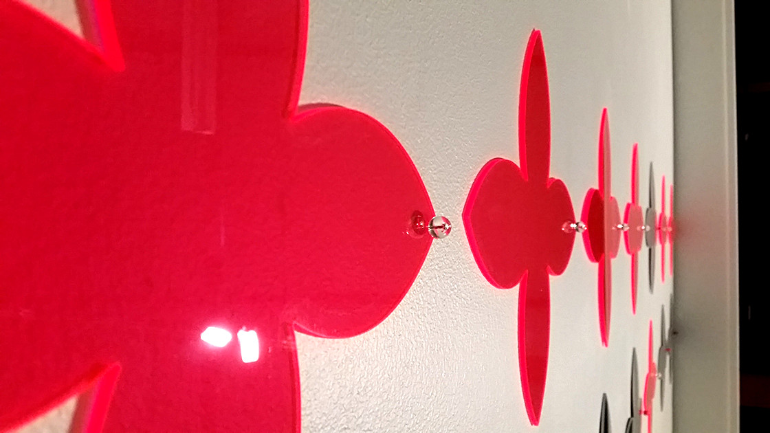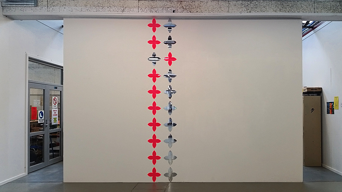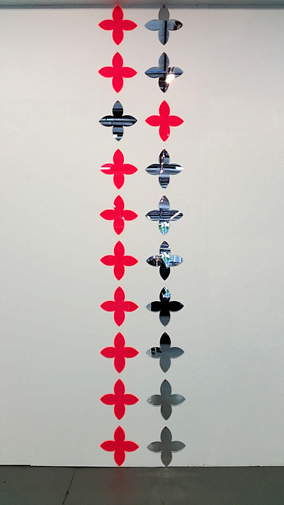 The above was the inspiration for creating this work, consisting of two parallel lines of ten hybrid Polynesian forms, differing in the placement of two of the forms. Ten mirrors and ten fluorescent pink shapes make up the work.