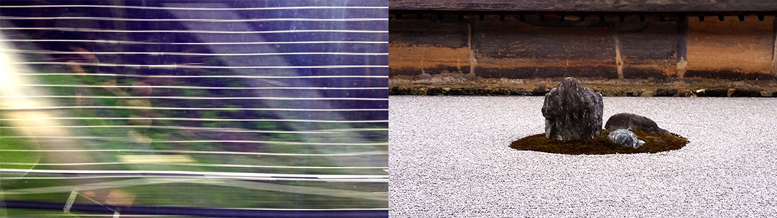 It is not known what the white lines were in the left side of the image. What is close travels swiftly past the window on the Shinkansen. Of the series, this one perhaps best captures the notion of traveling and destination - the Ryoanji Temple garden. The lines highlight a sense of direction, of travel. The rocks are the destination.