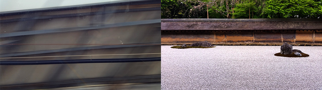 This image competes the set of stone clusters in the garden. Rushing past the Shinkansen window are the structures that support modernity. There are linkages of visual coincidence. Above all, the contemplation of the garden is paramount. This is the kind of experience of nature that is important for humanity as we face climate change and environmental degradation.
